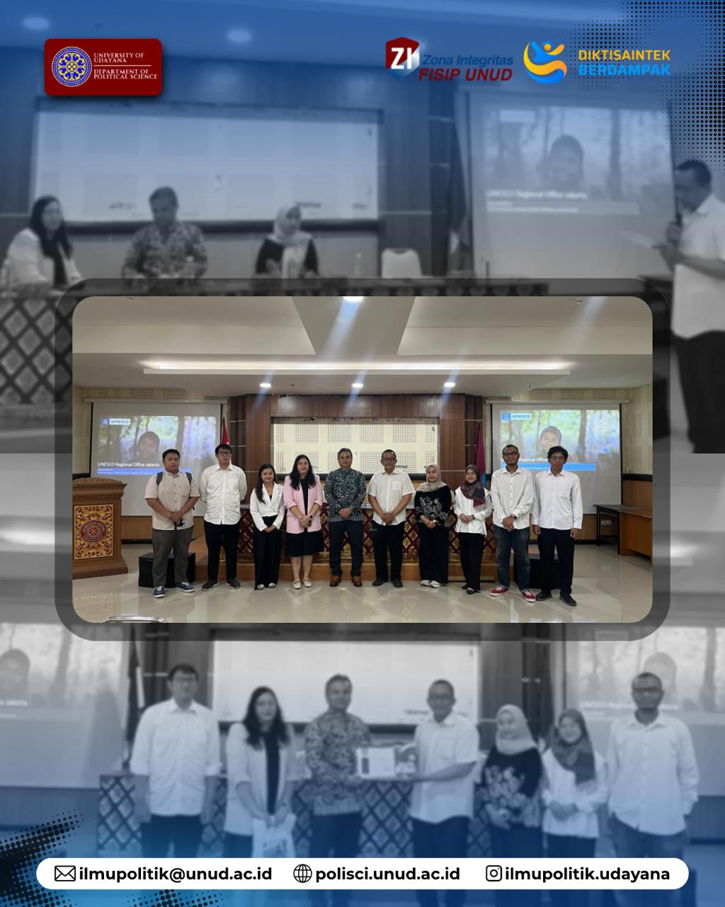 Denpasar, Program Studi Ilmu Politik FISIP Universitas Udayana melaksanakan courtesy meeting dengan perwakilan UNESCO Regional Jakarta. Pertemuan berfokus pada kesetaraan gender di dunia pendidikan, mencakup penguatan kebijakan internal yang sensitif gender, peningkatan literasi dan kapasitas sivitas akademika, penataan mekanisme data dan pelaporan, serta pengembangan strategi komunikasi publik yang inklusif.